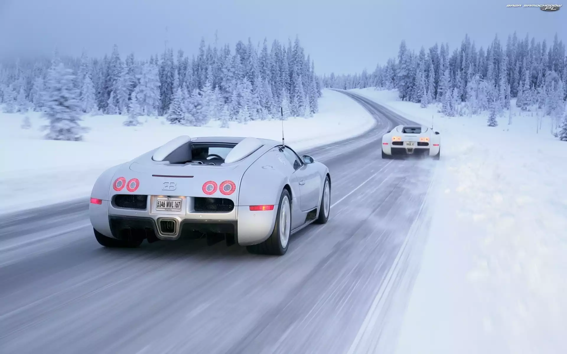 Droga, Zima, Bugatti, Lasy- Zdjęcia samochodów